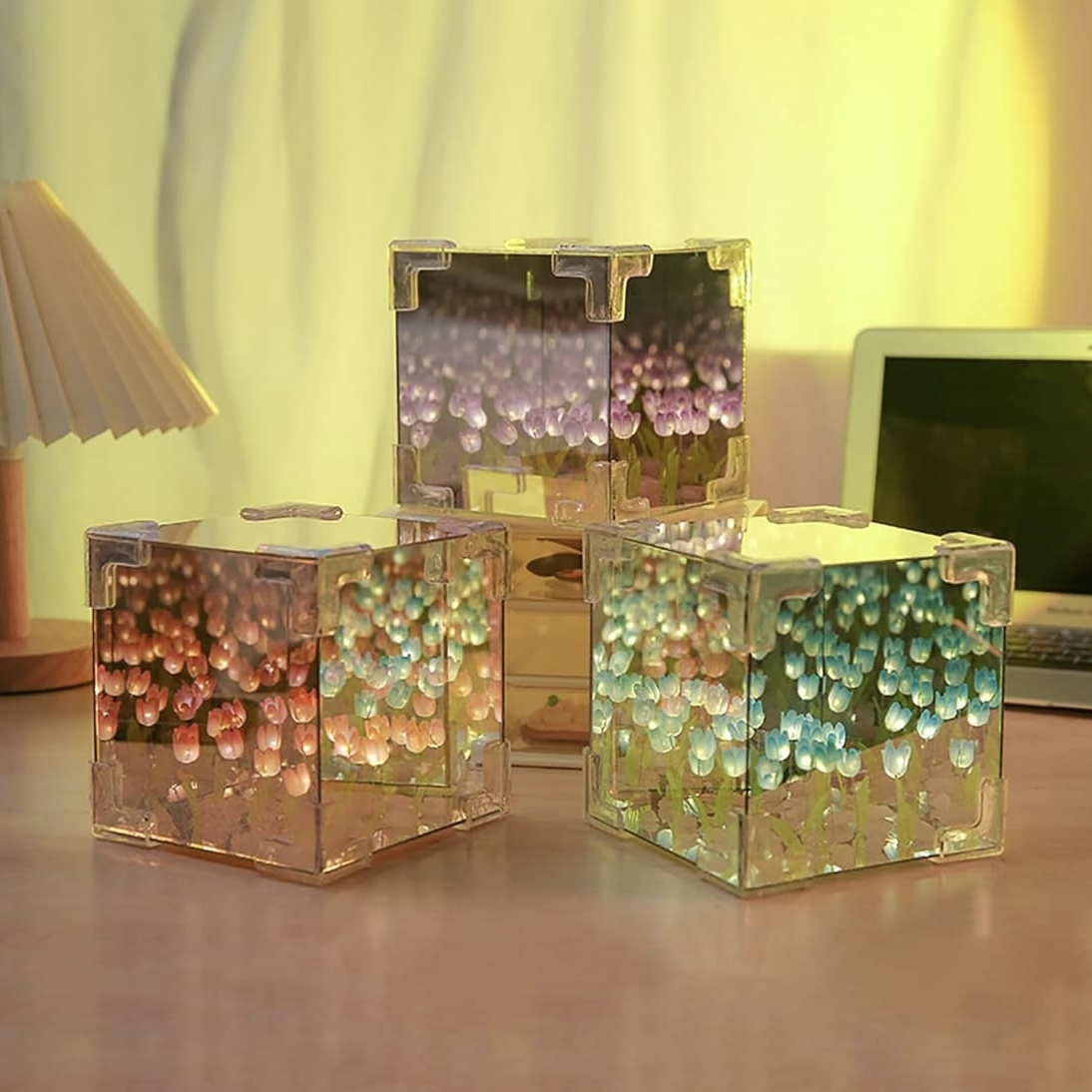 Esta cubo de Tulipanes, sirve como espejo y también como una bella lámpara con efecto infinito, es realmente una belleza.