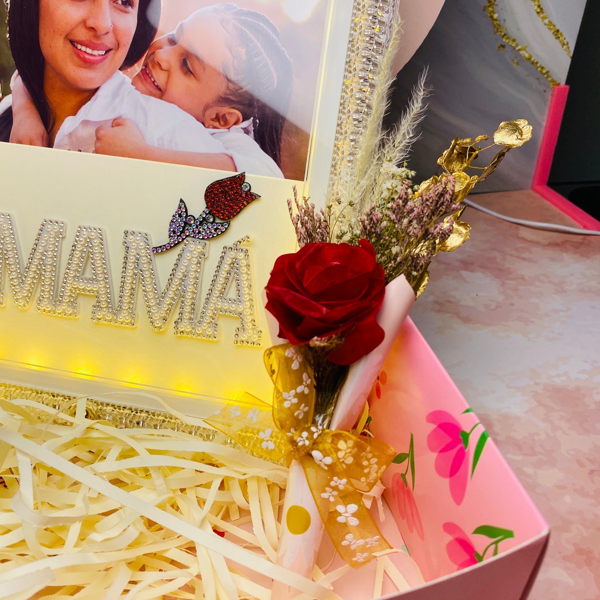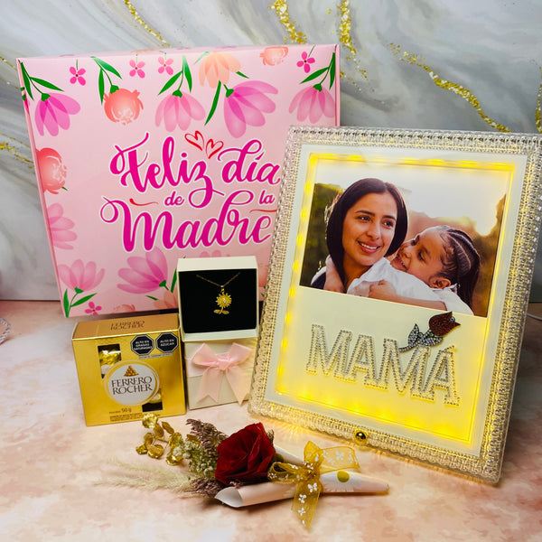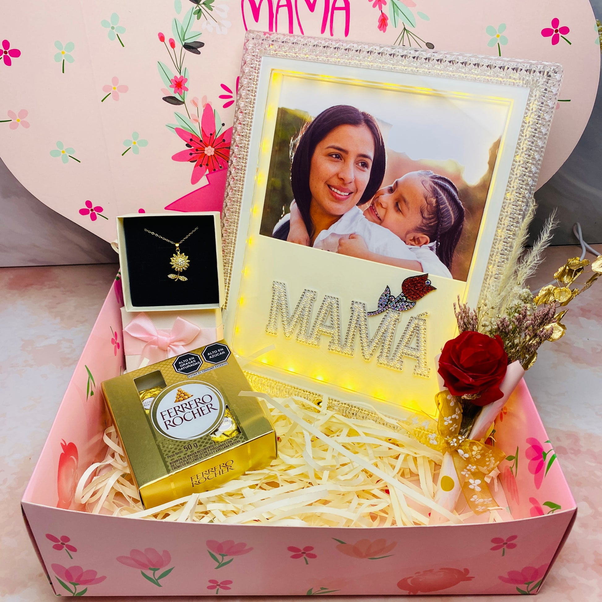 Este precioso box tiene como pieza principal, este portaretrato dedicado a Mamá. Es un detalle único ya que no es un portaretrato cualquiera, puede servirle como una lámpara de noche o como un hermoso adorno. Además que representa todo el amor que le tienes 🥰